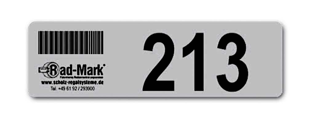 Etikett bedruckt, wiederabziehbar, aus hochfestem PVC, zur Kennzeichnung des Regalfachs mit der zugehörigen Rad-Mark®-Nummer in Yellow, Silver, Red, Blue oder Magenta. Mit fortlaufender Nummerierung (von 1-9999 frei wählbar), schwarz bedruckt. Individuelle Beschriftung auf Wunsch möglich und gegen Aufpreis. Maße: 120 x 25 mm B/H