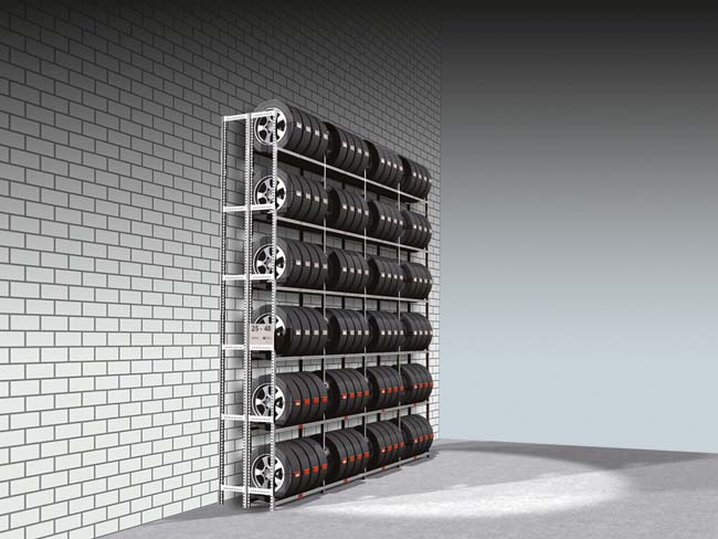 - Eine Ebene je nach Regalbreite passend für bis zu 8 Räder/Reifen je Ebene