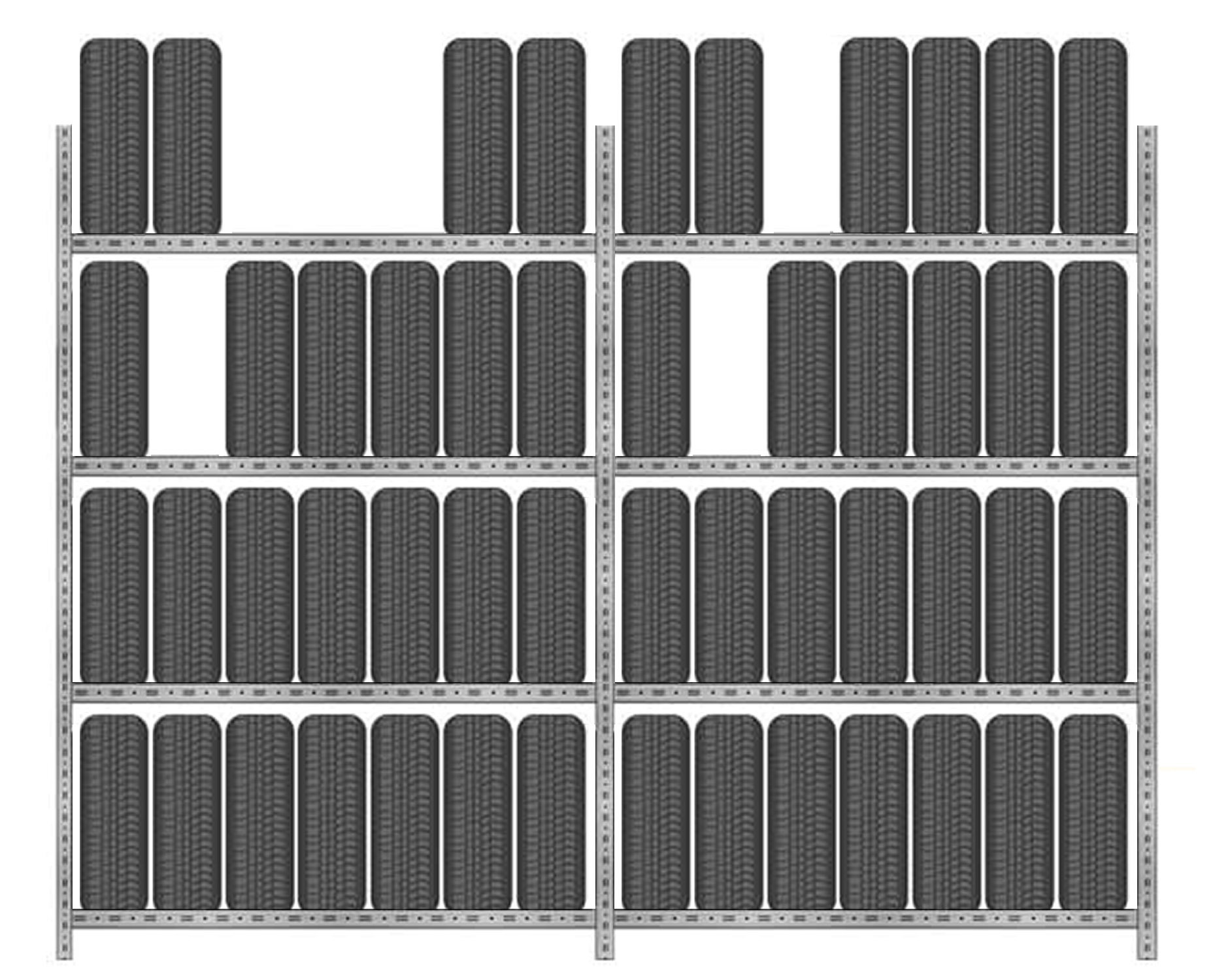 - <b>Set Räderregal mit Anbaufeld MEGOBULLY 4 Ebenen (Höhe 3480 mm). Systembreite 1680 mm, Gesamtbreite 3500 mm. Platz für insgesamt 56 Räder (75cm Breite).</b> <div>Erweiterungen mit Verbindungs-Set zur 2 + 2 Räder-Lagerung als Doppel- und Blockregal: